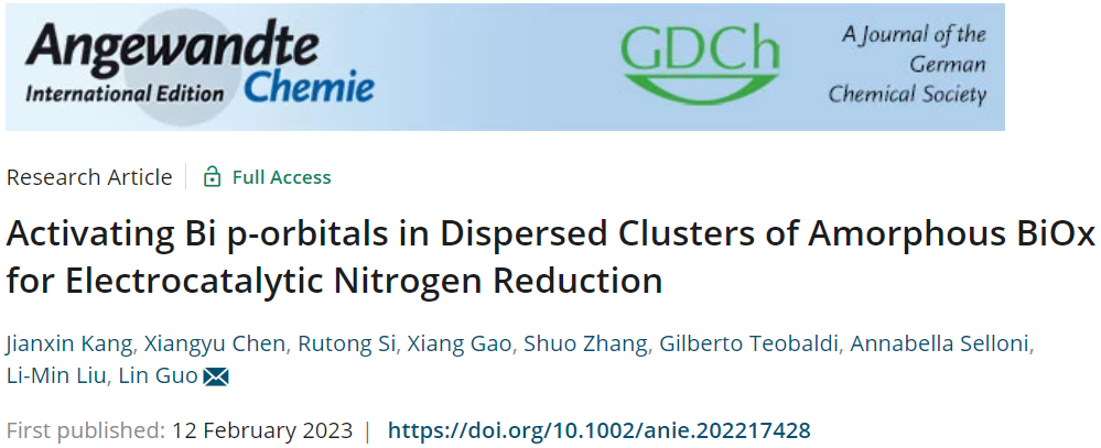 近日,化学学院郭林教授和物理学院刘利民教授研究团队在高度分散的原子级非晶BiOx团簇可控制备及其电催化氮气还原反应方面取得新进展。相关工作以“Activating Bi p-orbitals in Dispersed Clusters of AmorphousBiOxfor Electrocatalytic Nitrogen Reduction”为题,2023年2月12日在线发表在《AngewandteChemieInternational Edition》杂志上。该研究获国家自然科学基金项目(No.51532001, 11974037)等资助。化学学院副教授康建新为文章的第一作者,化学学院博士生陈翔宇和北京计算科学研究中心博士生司如同为共同一作,北京亚洲成人在线一二三四五六区为该论文的第一完成单位。